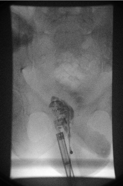 Figure 1: Transrectal injection of contrast-agent into the right seminal vesicle confirms correct location of needle. Fluoroscopy.
