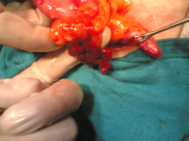 Figure 2: Detorsion of the appendix epiploica was done. Also seen is the grossly normal vermiform.