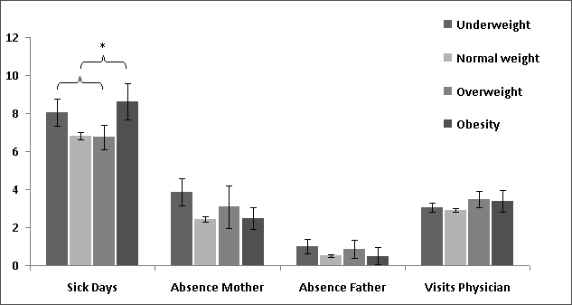 Figure 1: Bar chart of sick days, maternal and paternal absence from work, and visits to a physician by BMI weight groups