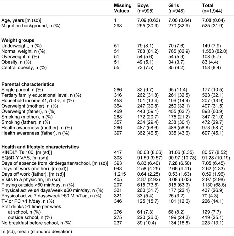 Parents of 1,968 children gave their written informed consent. 1,947 children took part in baseline anthropometric measurements between September and October 2010, and parental questionnaires were completed by 1,714 participants. Parents provided information on lifestyle and health behaviour, physical activity patterns and the living environment of the children.