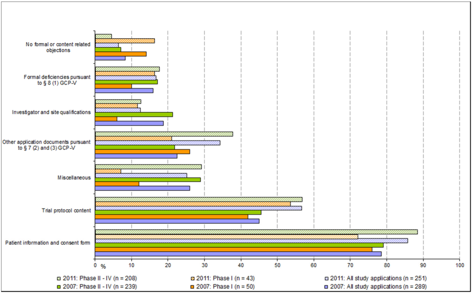 Wie in 2007 ist etwa jeder sechste Antrag unvollständig und weist formale Einwände zu den Antragsunterlagen auf. Während der Anteil der Studienanträge mit Einwänden bezüglich der Patienteninformation und Einwilligungserklärung (+7,2%), den Prüfplaninhalten (+11,6%) und „Sonstigen Antragsunterlagen“ nach § 7 (2) und (3) GCP-V (+11,8%) in 2011 im Vergleich zu 2007 zunahm, nahm der Anteil der Studienanträge mit Einwänden, die Unterlagen zur Prüfer- und Prüfstellenqualifikation betrafen, um 6,3% ab.