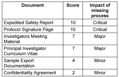 For all core documents assessed in step 1 the level of effort required for tracing or replacing the document was assessed. If the original was available the document type received a risk score of 1; if a copy could be filed in the TMF, the missing document received a score of 2. When the document was missing, but the process could be proved to have taken place using other documents, the effort of this verification was assigned a score of 3 to 6.