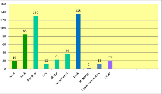 The different groups of instruments provided a clear picture of the typical locations of pain. These results showed correlations between instrument and pain location. The high strings were the group with the highest rate of chronic pain in the shoulder (1st violin n=62, 2nd violin n=18).