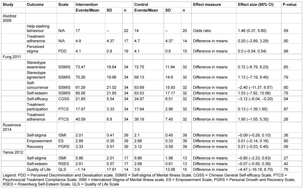 Outcomes were drawn from the proposed logic model. They were divided into treatment-related outcomes (e.g. recovery, treatment adherence, quality of life); social outcomes (e.g. vocational or educational success, experienced stigma); personal (psychological) outcomes (e.g. self-stigma, perceived stigma, self-efficacy, self-esteem), life achievements (e.g. employment, education) and adverse effects. Length of follow-up was categorized into short-term (<3 months), medium-term (3–6 months) and long-term (>6 months).