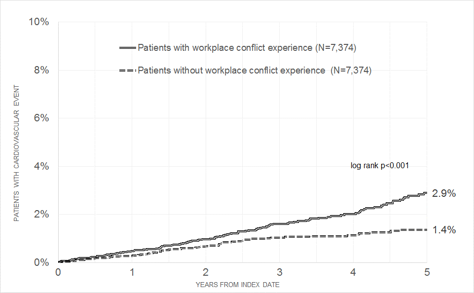 Figure 2: Kaplan-Meier curves for time to the diagnosis of cardiovascular disorders in primary care patients with workplace conflict experience and matched controls