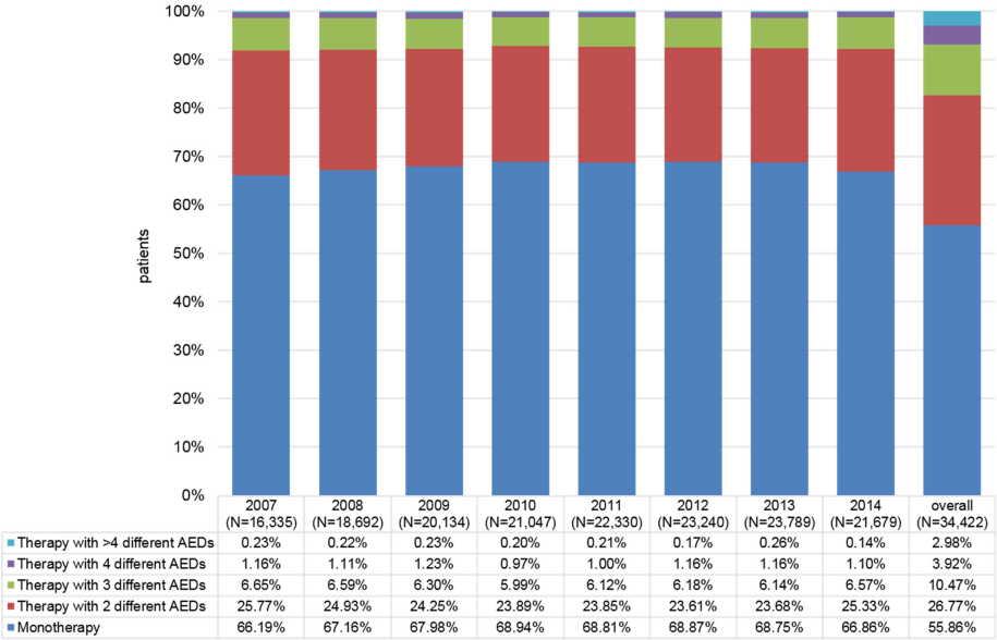 Der Anteil prävalenter Patienten, die eine Monotherapie erhielten, war über den Beobachtungszeitraum konstant mit einem Minimum von 66,2% (2007) und einem Maximum von 68,9% (2010). Der Anteil der Patienten mit zwei verordneten antiepileptischen Wirkstoffen in einem Jahr lag zwischen 23,6% (2012) und 25,8% (2007). Die verbleibenden Patienten erhielten drei (von 6,0% in 2010 bis 6,7% in 2007), vier (von 1,0% in 2010 bis 1,2% in 2009) oder mehr als vier verschiedene Antiepileptika (zwischen 0,1% in 2014 und 0,3% in 2013). Zwischen 8,1% (2007) und 16,6% (2014) der Patienten erhielten keine antiepileptische Medikation im Beobachtungszeitraum.