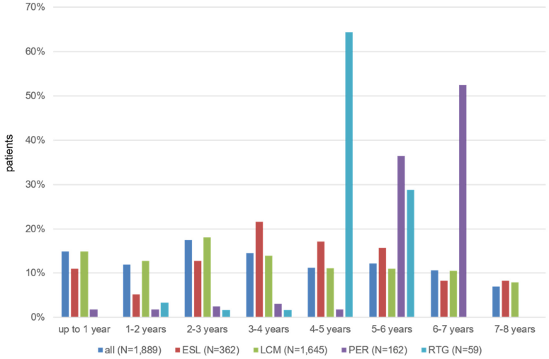 Mean duration from the date of the first observed FE diagnosis to the date of the first prescription of a novel AED was 3.59 years (SD 2.19). This time ranged from 3.58 years (SD 2.22) for LCM up to 5.69 years (SD 1.22) for PER. About one third of the patients received a novel AED only 5 years after first FE diagnosis (Figure 3 [Fig. 3], Table 7 [Tab. 7]).