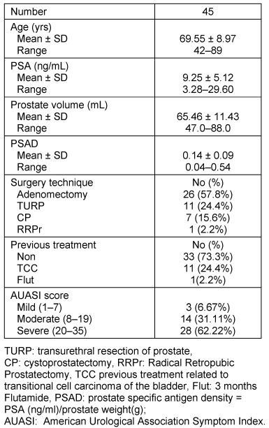 Table 1 [Tab. 1] shows the major characteristics of the patients under the study. A total of 45 benign prostate tumor patients were included. The mean age was 69.55 ± 8.97 with a range of 42–89 years. PSA level was 9.25 ± 5.12 ng/mL with a range of 3.28–29.60 ng/mL. The volume of prostate was 65.46 ± 11.43 mL with a range of 47.0–88.0 mL. The PSAD, prostate specific antigen density, was 0.14 ± 0.09 ng/ml/cm3 with a range of 0.04–0.54 ng/ml/cm3. With respect to surgery techniques, 26 patients (57.8%) had adenotectomy, 11 (24.4%) had transurethral resection of prostate, 7 (15.6%) had cystoprostatectomy and one patient (2.2%) had radical retropubic prostatectomy. With respect to the previous treatments, 33 out of 45 (73.3%) had no treatment while 11(24.4%) had treatment related to transitional cell carcinoma of the bladder. With respect to the severity of BPH, the American Urological Association Symptom Index (AUASI) was used. Three cases out of 45 (6.7%) were mild, 14 (31.1%) were moderate and 28 (62.2%) were severe.