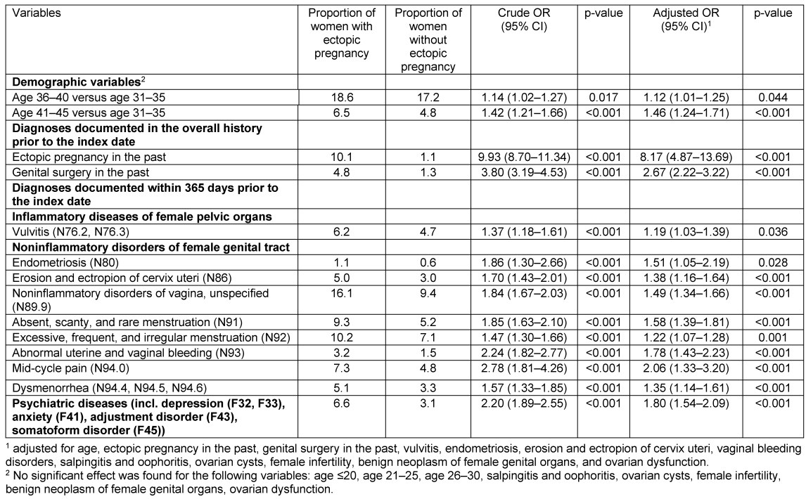 Schlussfolgerungen: Vorhergegangene Extrauteringravidität und Operation im Genitalbereich waren eng mit Extrauteringravidität bei in deutschen gynäkologischen Praxen behandelten Frauen assoziiert. Psychiatrische Erkrankungen hatten einen zusätzlichen Einfluss auf das Risiko einer Extrauteringravidität.
