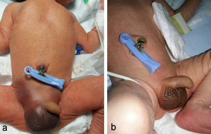 A late preterm male neonate (Ballard score: 36 weeks gestational age) was delivered by a 21-year-old woman at home with no professional care, no labors in pregnancy. The neonate was transported by ambulance to the nearest hospital, where he was resuscitated and intubated. Afterwards, he was again transported by ambulance to our tertiary NICU at approximately the 6th hour of life. Since the neonate was hemodynamically stable at the time of admission, he was extubated. He was a small for gestational age neonate with 2000 gr body weight. The examination of the abdomen was normal. Painless swelling of the scrotum and hydrocele were clinically observed. The neonate had a hematocrit of 48.6%, negative Coombs test and normal values of the coagulation parameters (activated partial thromboplastin time (aPTT), prothrombin time (PT), international normalized ratio (INR), platelet count and fibrinogen). He received vitamin K.