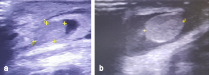 Figure 2: a) Ultrasonography of the right testicle. b) Ultrasonography of the left testicle. Both testicles are depicted inside the scrotum. The scrotal wall as well as the testicles are grossly thickened and edematous, while the echogenic structure and vascularity of the testicles are normal.