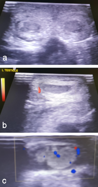 Figure 3: a) Ultrasonography of both testicles. b) Doppler ultrasonography of the right testicle. c) Doppler ultrasonography of the left testicle. Both testicles maintain their normal echogenic structure and vascularity. Thickening of the scrotum wall is still observed in the context of hematoma. A hydrocele with echogenic elements on the left scrotum (hematoma) is observed.