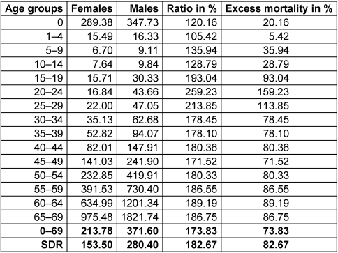 For men, premature mortality decreased by 21.5/100,000 in 9 years, corresponding to an annual average reduction of 2.39/100,000 deaths among men aged 0–69. A gender inequality can be seen from the fact that the percentage excess mortality of men was 82.67%, almost twice as high as the mortality of women (Table 1 [Tab. 1]). The differences in age-specific mortality rates have moved only marginally and have not changed the differences in life expectancy of 4.82 years in recent years.
