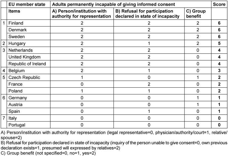 Regarding the group benefit (item C), which is not regulated at EU level for adults incapable of giving informed consent, the most liberal option is “explicitly allowed” (yes=2), and the next lower level is “explicitly prohibited” (no=1). National laws without a statement about group benefit must be associated with legal uncertainty, as a different classification could be made from study to study. From the patient’s point of view, the missing legal regulation is the worst conceivable option and at the same time the most restrictive (=0).