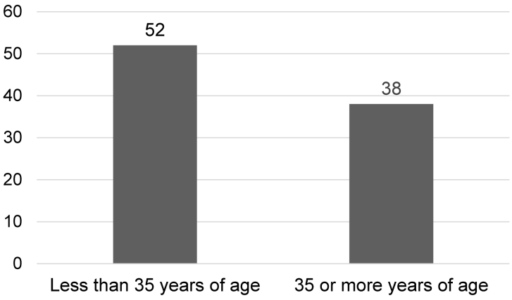 A total of 90 patients were enrolled in the study. There were 71.1% male and 28.9% female patients (Figure 1 [Fig. 1]). The mean age of patients was 35.1±12.9 years. 57.8% were below 35 years of age and 42.2% were 35 or more years of age (Figure 2 [Fig. 2]). 48.9% of patients presented with less than 10 days history of symptoms and 51.1% had symptoms lasting for 10 or more days at presentation.