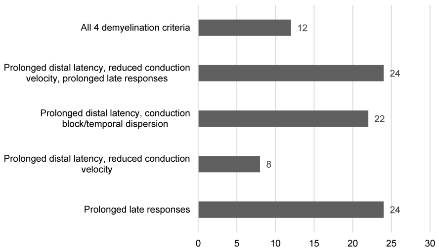 In our study, 26.6% of patients had only one demyelination criterion of prolonged late responses in one or more motor nerves. There were two different pairs of two demyelination criteria: 24.4% of patients had prolonged distal latency in two or more motor nerves and conduction block/temporal dispersion in one or more motor nerves; 8.9% of patients had prolonged distal latency and reduced conduction velocity in two or more motor nerves. 26.6% of patients were found to have three demyelination criteria: prolonged distal latency in two or more motor nerves, reduced conduction velocity in two or more motor nerves, and prolonged late responses in one or more motor nerves. The remaining 13.3% had all four demyelination criteria present in nerve conduction studies.