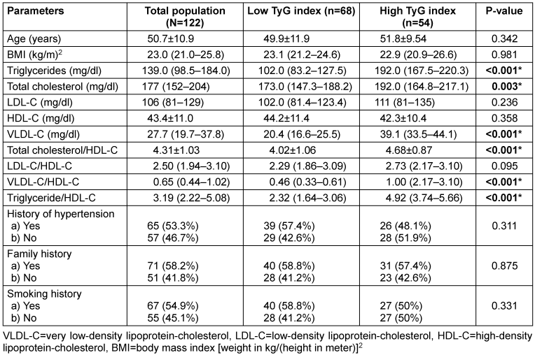 A total of 122 breast cancer patients were recruited, with a mean age of 50.7±10.9 years (range: 26–85 years). Table 1 [Tab. 1] presents the demographic and clinical characteristics of the subjects, categorized by TyG index using a cut-off value of 8.87. There were 54 (44.3%) breast cancer patients with high IR as assessed by TyG index in our cohort. No significant differences were observed between the two groups in terms of age, BMI, history of hypertension, smoking history, low-density lipoprotein cholesterol (LDL-C) levels, high-density lipoprotein cholesterol (HDL-C) levels, LDL-C/HDL-C ratio, or family history. However, the mean or median levels of triglycerides (TG), total cholesterol (TC), very low-density lipoprotein cholesterol (VLDL-C), total cholesterol/HDL-C ratio, VLDL-C/HDL-C ratio, and triglyceride/HDL-C ratio were significantly higher in the elevated TyG index group (Table 1 [Tab. 1]).