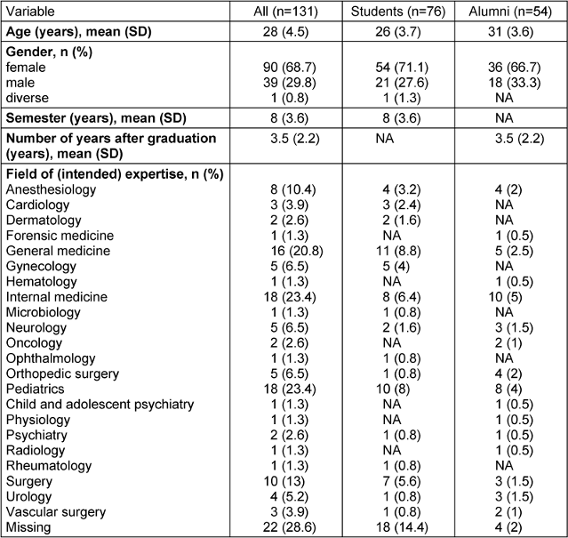 In total, 131 questionnaires were completed. Table 1 [Tab. 1] shows the sociodemographic data of the participants.