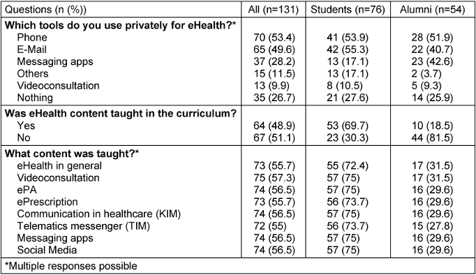 Table 3 [Tab. 3] provides an overview of which applications the participants use privately. It also shows whether and which eHealth content was taught in the curriculum.