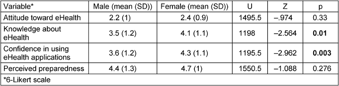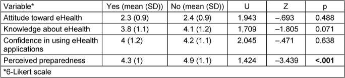 Table 4: Attitude and knowledge concerning the availability of eHealth content in the curriculum (yes vs. no): a group comparison using Mann-Whitney-U test