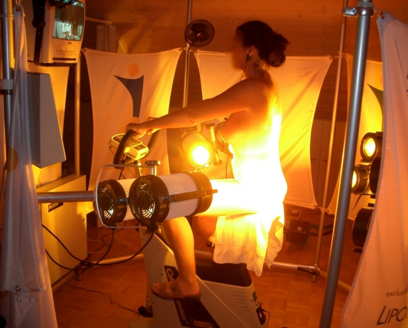 Therefore wIRA is suitable to be combined simultaneously with physical activity: a relevant part of the body surface can be irradiated with several wIRA radiators during a moderate bicycle ergometer endurance exercise. An endurance trained muscle covers a larger part of his energy demand by fat than an untrained muscle [32], [2]. Endurance trained persons have a higher insulin sensitivity of the skeletal muscles with consecutively lower insulin concentrations and decreased risks [33], [8], [2]. It seems physiologically plausible, that warming and metabolic increase of fatty tissue by wIRA simultaneously combined with a lipolytic stimulus by a long lasting moderate physical exercise (bicycle ergometer endurance work load) favors regional lipolysis more than physical load alone.