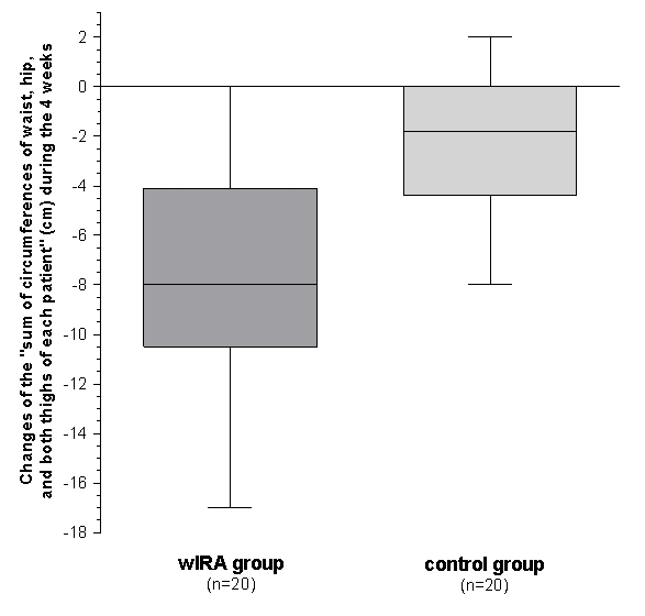 Ergebnisse: Die "Summe der Umfänge von Taille, Hüfte und beiden Oberschenkeln von jedem Patienten" verminderte sich während der 4 Wochen signifikant mehr (p<0,001) in der wIRA-Gruppe als in der Kontrollgruppe: Mediane und Interquartilspannen: -8,0 cm (-10,5 cm/-4,1 cm) vs. -1,8 cm (-4,4 cm/0,0 cm).