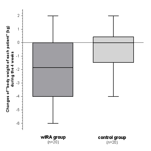Auch nahm das "Körpergewicht jedes Patienten" während der 4 Wochen in der wIRA-Gruppe deutlich mehr als in der Kontrollgruppe ab: Mediane und Interquartilspannen: -1,9 kg (-4,0 kg/0,0 kg) vs. 0,0 kg (-1,5 kg/+0,4 kg); der Median des Körpergewichts veränderte sich von 99,3 kg auf 95,6 kg (wIRA) vs. von 89,9 kg auf 89,6 kg (Kontrolle). Einen ähnlichen Effekt zeigte der Körpermasseindex BMI.