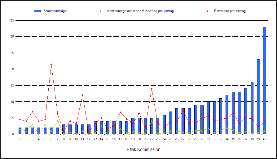 Abbildung 3: Anzahl der Studienanträge und Anzahl der Einwände pro Antrag; Verteilung auf die in der Umfrage involvierten 40 Ethik-Kommissionen