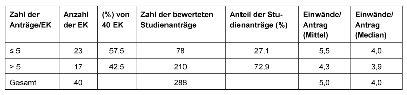 Tabelle 3: Anzahl der Studienanträge und Anzahl der Einwände pro Antrag; Verteilung auf 2 Gruppen der in der Umfrage involvierten Ethik-Kommissionen