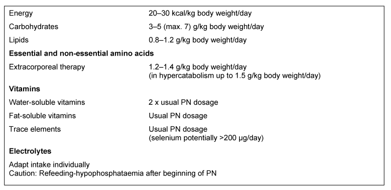 Patients with CRF or ARF, who do not require renal replacement therapy, are rarely catabolic, whereas dialysis is necessary in increased catabolism due to the associated increase of urea. Only a few of these patients require PN. The substrate requirements of acutely ill, non-hypercatabolic patients with CRF correspond to those of patients with ARF without renal replacement therapy (Table 4 [Tab. 4]).