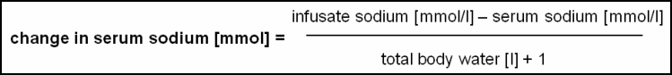 Figure 1: The formula of Adrogué et al. (33) offers an easy way to estimate the effect of 1 liter of any infusate on change in serum sodium concentration. Total body water is calculated as a fraction of body weight (children: 0.6; non-elderly women: 0.5; elderly women: 0.45; non-elderly men: 0.6; elderly men: 0.5).