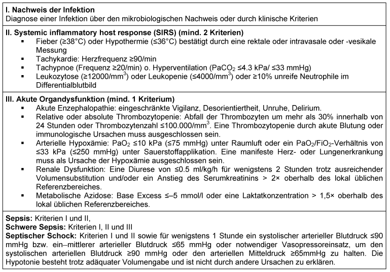 Leitlinien sind systematisch entwickelte Darstellungen und Empfehlungen mit dem Zweck, Ärzte und Patienten bei der Entscheidung über angemessene Maßnahmen der Krankenversorgung unter spezifischen medizinischen Umständen und unter Berücksichtigung des spezifischen nationalen Gesundheitssystems zu unterstützen. Die erste Revision der S-2k-Leitlinie der Deutschen Sepsis-Gesellschaft in Kooperation mit 17 weiteren wissenschaftlichen medizinischen Fachgesellschaften und einer Selbsthilfegruppe gibt den Stand des Wissens (Ergebnisse von kontrollierten klinischen Studien und Wissen von Experten) über effektive und angemessene Krankenversorgung zum Zeitpunkt der „Drucklegung“ wieder. Die Leitlinienentwicklung erfolgte entsprechend des „Deutschen Instrumentes zur methodischen Leitlinien-Bewertung“ der Arbeitsgemeinschaft der Wissenschaftlichen Medizinischen Fachgesellschaften (AWMF). In Anbetracht der unausbleiblichen Fortschritte wissenschaftlicher Erkenntnisse und der Technik müssen periodische Überarbeitungen, Erneuerungen und Korrekturen unternommen werden. Die Empfehlungen der Leitlinien können nicht unter allen Umständen angemessen genutzt werden. Die Entscheidung darüber, ob einer bestimmten Empfehlung gefolgt werden soll, muß vom Arzt unter Berücksichtigung der beim individuellen Patienten vorliegenden Gegebenheiten und der verfügbaren Ressourcen getroffen werden.
