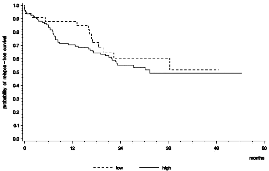 Figure 1: Relapse-free survival of patients whose tumors expressed p53-protein in a concentration higher than 0.15 ng/mg (solid curve) compared to low p53-expression (hatched curve)
