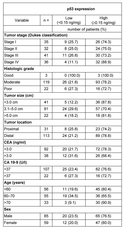 The relationship between p53 expression and several clinicopathological variables was examined and no correlation could be found with tumor stage, histological grade, tumor diameter or localisation, age, sex or the tumor markers CEA and CA 19-9 (Table 1 [Tab. 1]).