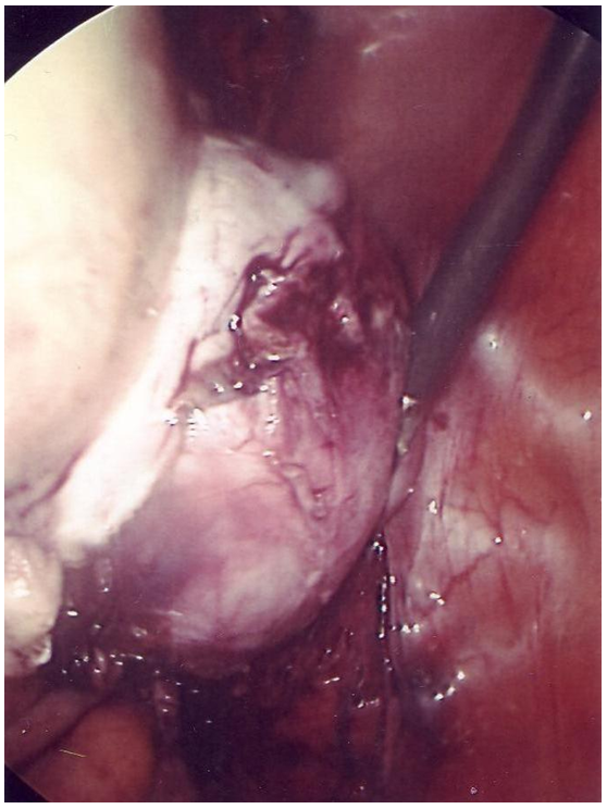 Uterine lipoleiomyoma is a rare benign tumor with an estimated incidence of 0.03% to 0.2% [1]. A 48 year-old, gravida 1 para 1, had a slowly-growing cervical mass. On ultrasound, the mass was around 5 cm in diameter and had fibroid tissue consistency with components of fat consistency (Figure 1 [Fig. 1]). On computed tomography (CT), the tumor appeared encapsulated and measured 6.2×5.2 cm with some areas of what looked like necrosis suggestive of a degenerating fibroid. No adenopathy was detected. The uterus was hypertrophic, sounding to 10 cm, and curettage showed no malignancy. After consultation with the patient, we decided to proceed with total laparoscopic hysterectomy and bilateral salpingo-oophorectomy. Operative findings included a large cervical fibroid that appeared somewhat fleshy and soft in texture (Figure 2 [Fig. 2]). First, the adhesions of the sigmoid colon to the left pelvic sidewall were taken down. The infundibulopelvic ligaments, after visualizing the ureters to be separate from them, were bilaterally coagulated and transected. The broad ligament anterior peritoneum was undermined and transected from round ligament to round ligament. The broad ligament posterior peritoneum was undermined and transected to the level of the uterosacral ligament on each side allowing the ureters to retract laterally away from the uterus, increasing the safety of the procedure. With some trouble, dissection was done to free the bladder from the cervical tumor. The vessels on the left side were then coagulated with bipolar cautery and transected with Harmonic scalpel. The cardinal ligament was taken down with Harmonic scalpel dissection. On the right side, again with difficulty the uterine vessels were skeletonized then coagulated and transected the same way as before. The cardinal ligament on this side was transected the same way. A sponge stick was placed in the anterior vagina and transverse incision was made over it and around the vagina separating it from the cervix. With the help of a tenaculum, the uterus with the cervical mass and adnexa were all removed and passed off. The operation was then continued as usual with uterosacral-cardinal-ligament suspension. Cystoscopy showed indogocarmine coming from both ureteral orifices, excluding ureteral injury. The operation was completed in 68 minutes and blood loss was approximately 150 cc. On opening of the resected tumor, no necrotic areas were noted. Pathological report showed a 258 gram uterus with a lipoleiomyoma that originated in the parametrial soft tissue along the endocervical canal near the lower uterine segment. The maximum dimension of the tumor was 5.5 cm. Incidentally, a 2.1 cm adult granulosa cell tumor was found within the parenchyma of the right ovary.