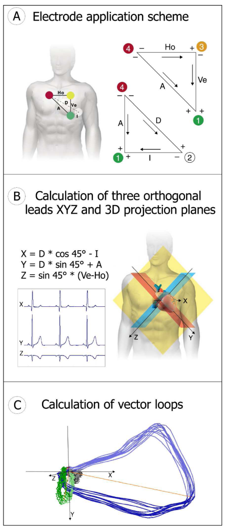 Because a single human heart cycle does not quantitatively fulfill these conditions, a method for analyzing 3D electrocardiography data, known as vectorcardiography (VCG) was developed the late 1930s and many different VCG lead methods advanced since then [35], [36], [37]. The most common is the 7-lead method developed by Frank [38]. VCG was especially popular from the 1950s to 1980s. A widely published method, it was mainly used for ischemia diagnosis and has proved its potential in principle [39], [40], [41], [42], [43], [44], [45]. For example, Mengden et al. retrospectively showed that VCG using 5 parameters for discriminant analysis has a sensitivity of 77.8% and a specificity of 78.4% in diagnosing a coronary condition compared to coronary angiography [39]. Difficult to interpret, VCG never became established as a routine method and, despite new approaches for use in ischemia [46], has lost importance.