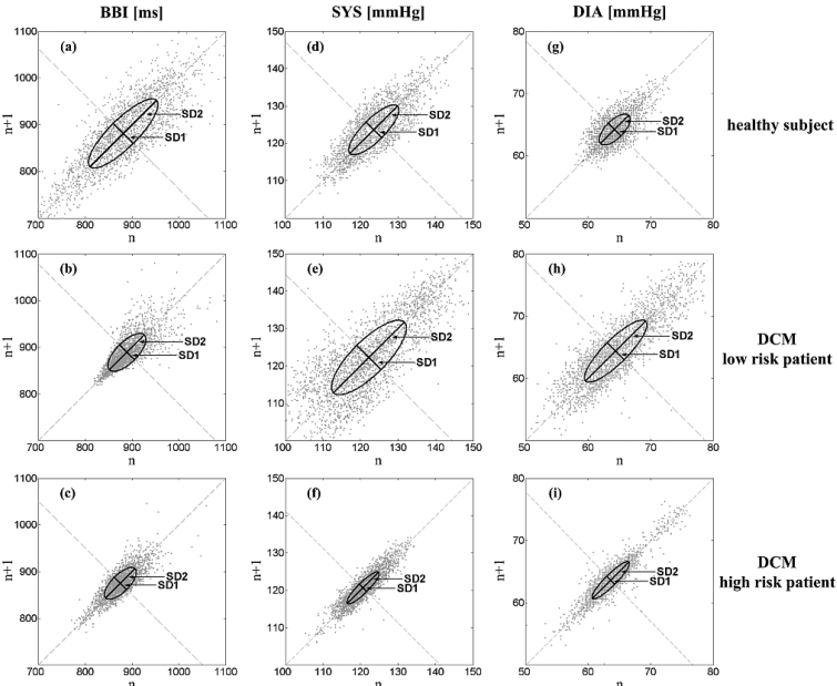 Figure 8: Poincaré plots calculated from HRV (tachogram, a-c), from BPV (systolic d-f SYS; diastolic g-i DIA) blood pressure time series of a healthy subject (top row), a DCM patient with low risk (middle row) and a DCM patient with high risk (bottom row), see also [83]