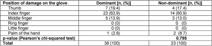 Table 3: Comparison of position of glove damage between the dominant and the non-dominant hand