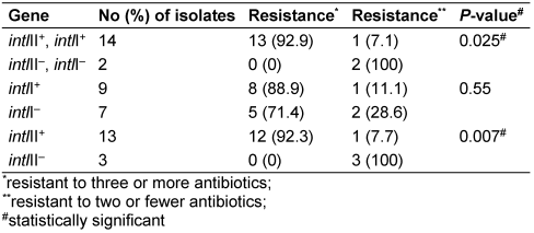 Correlation between the occurrence of intlI, intlII and intlIII genes and multidrug resistance was calculated using Fisher’s exact test. A P-value <0.05 was considered statistically significant.