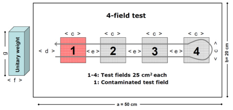 Figure 1: Diagram of the 4-field test [10] showing test surface (20x50 cm) with four test fields (5x5 cm) and stipulated wiping route of the wiping cloth. a=50 cm, b=20 cm, c=5 cm, d=10 cm, e=5 cm; the f and g dimensions of the unitary weight were at least 8.6 cmx12.1 cm, respectively, the block weighs 2.5 kg. The wiped area includes fields 1–4 with the turnaround at test field 4. Test field one is contaminated [10].