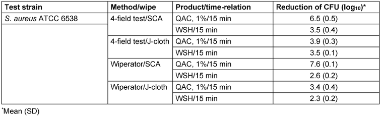 Table 3: Mean log10 reduction of S. aureus and P. aeruginosa by exposure to a disinfectant solution based on QAC at 2% with a SCA-wipe with both the 4-field test and Wiperator method at a contact time of 15 min (n=3)