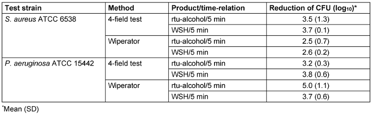 Table 5: Mean log10 reduction of S. aureus and P. aeruginosa by exposure to an alcohol-based rtu-wipe with the 4-field test and Wiperator method at 5 min contact time (n=3)