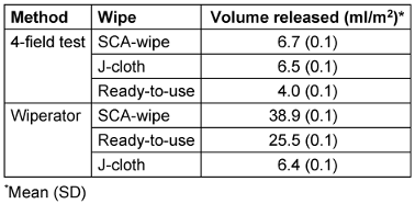 Table 7: Volume output of J-cloth, SCA-wipe and rtu-wipe using the 4-field test and Wiperator method (n=3)