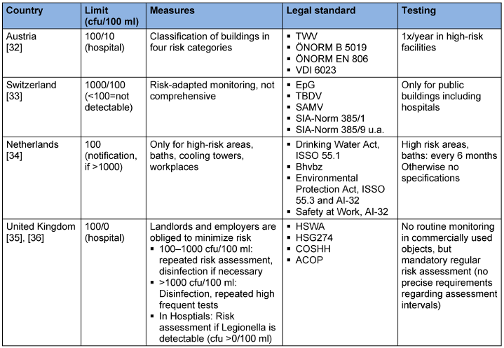 For preventive and environmental medicine, the ALARA (“as low as reasonably achievable”) principle adopted from radiation protection applies. But what is reasonably achievable with regard to the concentration of Legionella and given the paradoxical dose-response relationship? Preventive health measures have high priority, as the course of legionella pneumonia can be dramatic [31], [32], [33]. Although the goal must be to prevent all these cases, the relevance of legionella prevention is questionable in relation to other preventable deaths. At the moment, it is speculative that we can effectively prevent disease/deaths from legionellosis by conducting regular laboratory testing in apartments. Thus, it should be discussed whether it would be appropriate to restrict the mandatory monitoring to public buildings, hospitals, retirement/nursing homes, cooling towers, hot tubs, etc. [34], as in neighboring countries (see Table 2 [Tab. 2], [35], [36], [37], [38], [39]), because the right to preventive protection for these buildings and facilities can be postulated as different from private apartments. Furthermore, the question arises whether there is a certain degree of individual responsibility for personal health with regard to the house plumbing system, especially since regular use and correct temperature regulation already considerably reduce risks in many cases. In this sense, would not alcohol and tobacco abstinence be suitable for preventing a large number of legionellosis as well as other pneumonia cases (together with better vaccination coverage for pneumococci in the respective risk group, [40])? In terms of preventive health protection, well-known public health strategies could be considered, such as information campaigns, brochures in general practitioners’ offices, etc. The objection can be raised that well-established protective measures are difficult to revoke; however, with good arguments it is possible. One argument would be that they have no proven benefit.