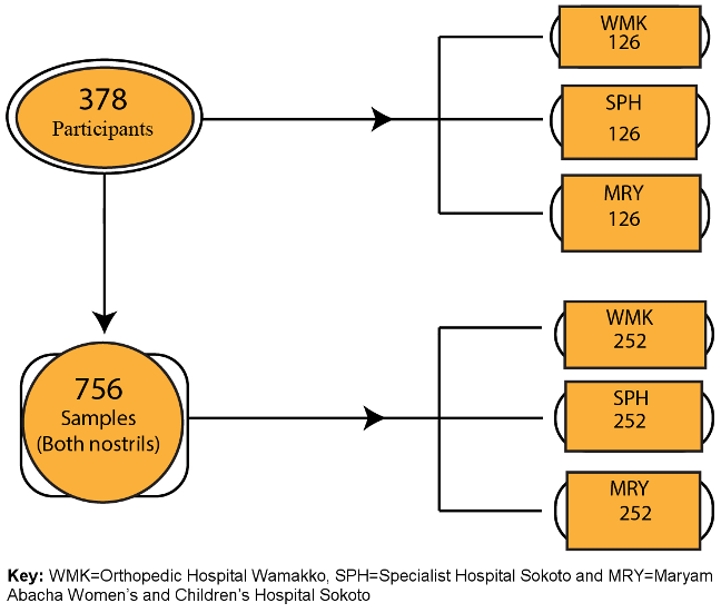 A total of 756 nasal samples were obtained from 378 participants across three study centers within the six-month (February 2018 to July 2018) study period (Figure 3 [Fig. 3]). Briefly, 202 samples from healthcare workers (HCW), 214 from outpatients, 148 from inpatients, 108 from security personnel and 84 from janitors. A detailed summary of study participants is presented in Table 1 [Tab. 1]. Phenotypic screening of isolates obtained in this study revealed a total of 131 (17.3%) coagulase-positive staphylococci out of 756 samples. Of this number, there were 81 (61.8%) S. aureus, 36 (27.5%) Staphylococcus intermedius, 6 (4.5%) Staphylococcus hyicus and 8 (6.1%) Staphylococcus schleiferi. The percentage carriage of S. aureus among participants in Specialist Hospital Sokoto was the highest (13.1%) compared with other hospitals in the study. Overall, healthcare workers were the participants with the highest carriage rate (12.9%).