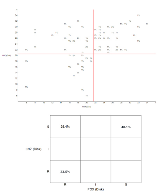 Figure 6: Scatterplot showing the relationship between cefoxitin (FOX) and linezolid (LNZ) susceptibility profiles of S. aureus isolates