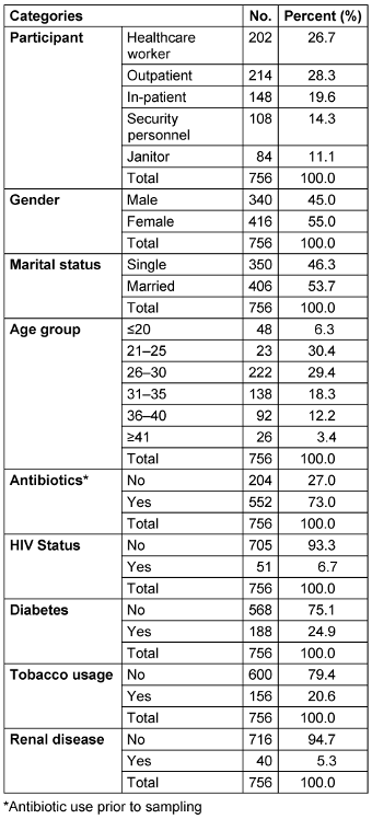 Overall, the category of participants with the highest carriage rate was healthcare workers, probably because of greater exposure to circulating microbes [27]. Healthcare workers (HCWs) are more often colonized, serving as a reservoir for endogenous infections and dissemination [28]. This is corroborated by the 31% prevalence rate reported among health-care workers by other authors [29].