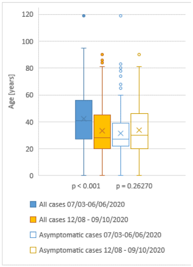 The proportion of asymptomatic persons not reporting at least one symptom (Figure 2 [Fig. 2]) who tested positive for SARS-COV-2 in the second period was 55% (286 of 520 cases), whereas during the first wave from March to June 2020, this percentage was 14.4% (169 of 1,170 cases). The median age of all cases in the first period was 41 years (0–119), and in autumn it was 28 years (0–90; p<0.001; Figure 3 [Fig. 3]). Comparing the median age of asymptomatic cases, there is no statistically significant difference: median age 27 years (0–119) in spring versus 30 years (0–90) in autumn (p=0.26270).