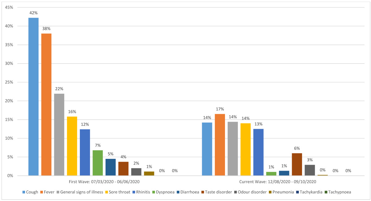 On the other hand, fever and cough were the leading symptoms in all age groups in Regensburg during the first wave (data from a case series of 1,084 consecutive cases, not yet published). It is not clear why these symptoms are reported in such a low proportion in the second period.