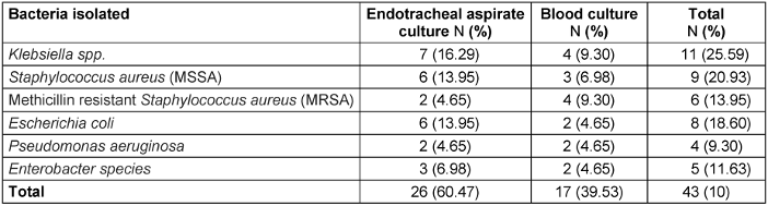 A total of 43 positive cultures (12.46%) of the blood and endotracheal aspirate samples were obtained. The most common bacteria isolated from endotracheal aspirate and blood cultures included Klebsiella species 11 (25.59%), S. aureus (MSSA) 9 (20.93%), E. coli 8 (18.6%), S. aureus (MRSA), 6 (13.95%), and Enterobacter species 5 (11.63%), as well as confirmed presence of P. aeruginosa 4 (9.30%) (Table 1 [Tab. 1]). The sensitivity patterns to tested antibiotics are shown in Figure 1 [Fig. 1].